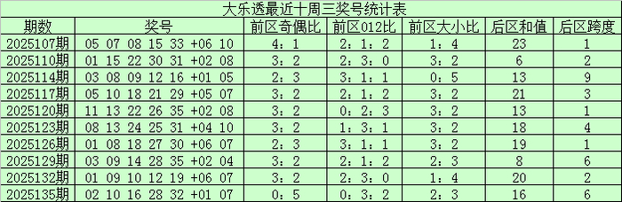 前区奇偶走势:上期前区奇偶比为3:2,上周三前区奇偶比0:5,最近十周三奇偶号码走势基本平衡,本期预计奇数号码转热,关注奇偶比3:2。
