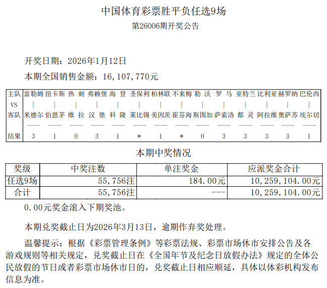 北京时间1月12日,胜负彩第26006期任九开奖结果揭晓。本期任九开出55,756注,单注奖金184元。本期任九投注总额为16,107,770元。