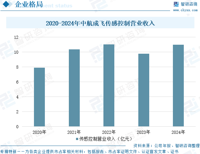 中航成飞股份有限公司目前业务和产品主要涉及飞机测控产品、配电类产品、吊挂投放系统、电阻应变计、应变式传感器、称重仪表和软件、智能传感器、消费电子领域产品、智能物流装备、工业称重控制、智能仓储、在用车检测、特种车辆检测、智能驾培、智能交通信息系统、ZOS管理软件、电磁阀等多个方向及领域。随着国家航空军工产业快速发展及“低空经济”、“一带一路”等战略的逐步实施,高精度工业测量与控制、自动化生产设备、系统解决方案业务等发展环境更趋优化。公司依托智能测控核心技术,以成为智能测控产品解决方案的一流供应商为目标,坚持军用与民用领域并重,不断提升核心竞争力。据统计,2024年中航成飞传感控制营业收入为10.95亿元,同比增长12.31%。