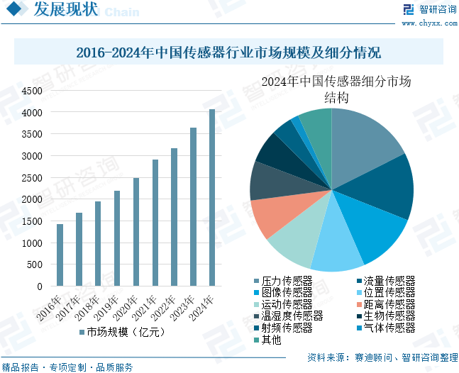 传感器是能感受到被测量的信息,并能将感受到的信息,按一定规律变换成为电信号或其他所需形式的信息输出,以满足信息的传输、处理、存储、显示、记录和控制等要求的检测装置。近年来,随着政策支持、智能制造升级、消费电子创新以及新能源汽车和物联网的快速发展,中国传感器市场迎来了前所未有的增长机遇。2024年,在政策支持、智能制造升级、消费电子创新、新能源汽车及物联网快速发展的推动下,中国传感器市场规模达到4061.2亿元,同比增长11.4%。从市场结构来看,压力传感器以714.2亿元的规模位居第一,占比17.6%;流量传感器以545.6亿元的规模超越图像传感器,升至第二位,占比13.4%;图像传感器则以505.9亿元的规模退居第三,占比12.5%。