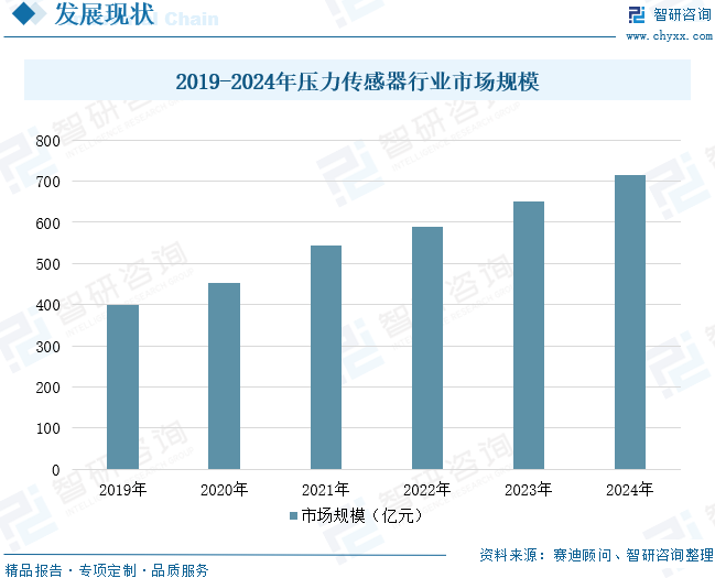 目前,在我国物联网产业的快速发展下,压力传感器作为我国“强基工程”的核心关键部件之一,是实现工业4.0转型升级、提升各类设备智能性和可靠性的重要组成部分。近年来,随着中国制造业转型升级和对高精度传感器需求的增加,压力传感器作为关键元件广泛应用于汽车、航空航天、医疗设备、智能家居等领域。与此同时,国家政策的大力支持和国内外市场需求的驱动,促使中国压力传感器行业逐渐形成完整的产业链,并在全球市场上占据重要地位。据统计,中国压力传感器行业市场规模从2019年的398.3亿元增长至2024年的714.2亿元,年复合增长率为12.39%。未来,随着科技的不断进步和应用场景的日益拓展,压力传感器的应用范围还将进一步扩大。