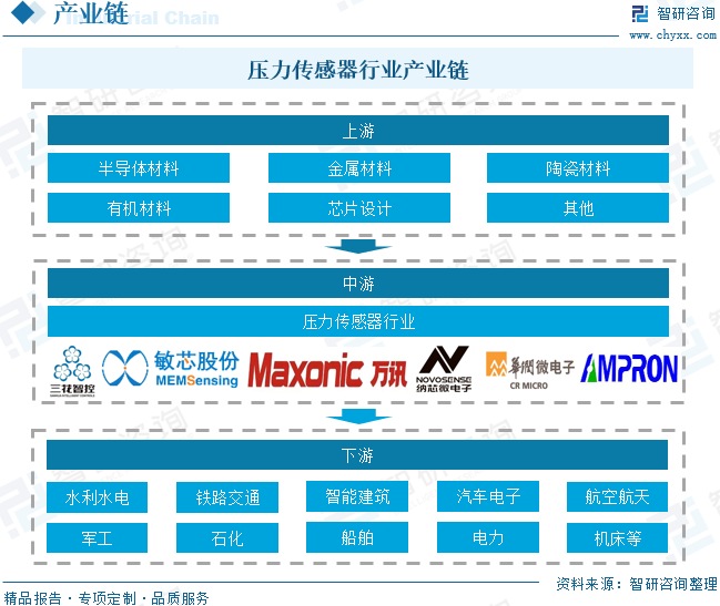 压力传感器是工业实践中最为常用的一种传感器。压力传感器产业链上游为原材料和芯片设计等,其中,原材料包括半导体材料、金属材料、陶瓷材料和有机材料四大类。产业链中游为压力传感器的生产制造。产业链下游为应用领域,压力传感器广泛应用于各种工业自控环境,涉及水利水电、铁路交通、智能建筑、汽车电子、航空航天、军工、石化、电力、船舶、机床、管道等众多行业。