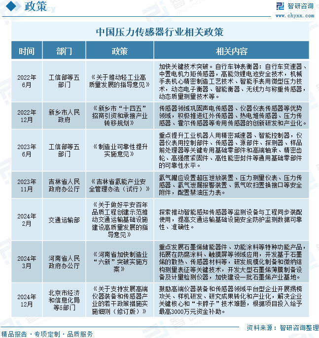 压力传感器则是传感器的一种,专门用于测量气体或液体的压力,并将其转换为电信号。近年来,国家高度重视传感器产业发展,出台了一系列支持政策,不仅推动了整个传感器行业的进步,也为压力传感器这一细分领域带来了显著的发展机遇。例如,2024年2月,交通运输部印发《关于做好平安百年品质工程创建示范推动交通运输基础设施建设高质量发展的指导意见》,探索推动智能感知传感器等监测设备与工程同步装配使用,提高交通运输基础设施安全防护监测数据可靠性、准确性。2024年12月,北京市经济和信息化局等5部门印发《关于支持发展高端仪器装备和传感器产业的若干政策措施实施细则(修订版)》,鼓励高端仪器装备和传感器领域平台型企业开展揭榜攻关、样机研发、研究成果转化和产业化,解决企业关键核心和“卡脖子”技术难题,根据项目投入给予最高3000万元资金补助。